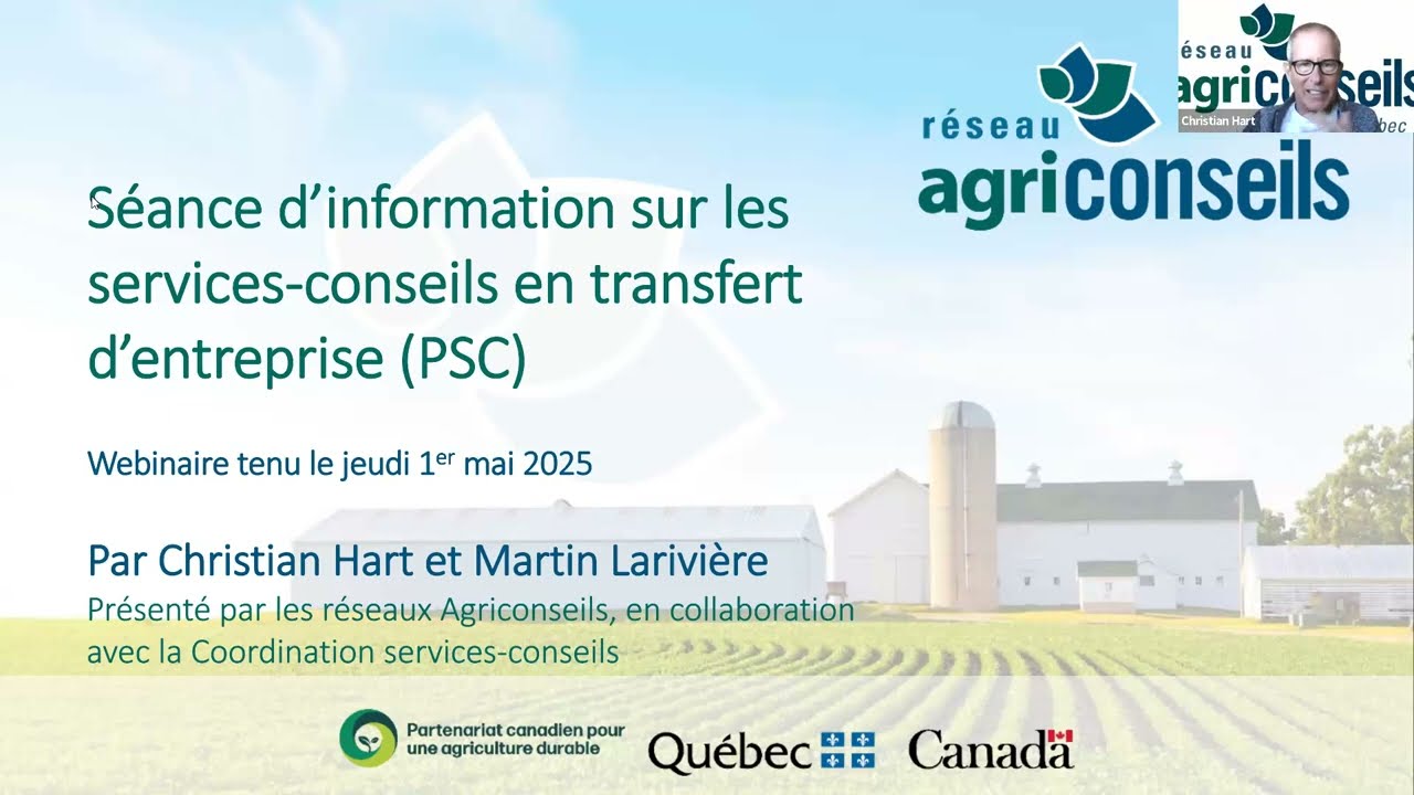 Le jeudi 1er mai 2025, les réseaux agriconseils, en collaboration avec la Coordination services-conseils, ont présenté un webinaire pour permettre aux dispensateurs de découvrir les nouveautés et obtenir des précisions sur la gestion des demandes de services-conseils en lien avec le transfert d’entreprise.