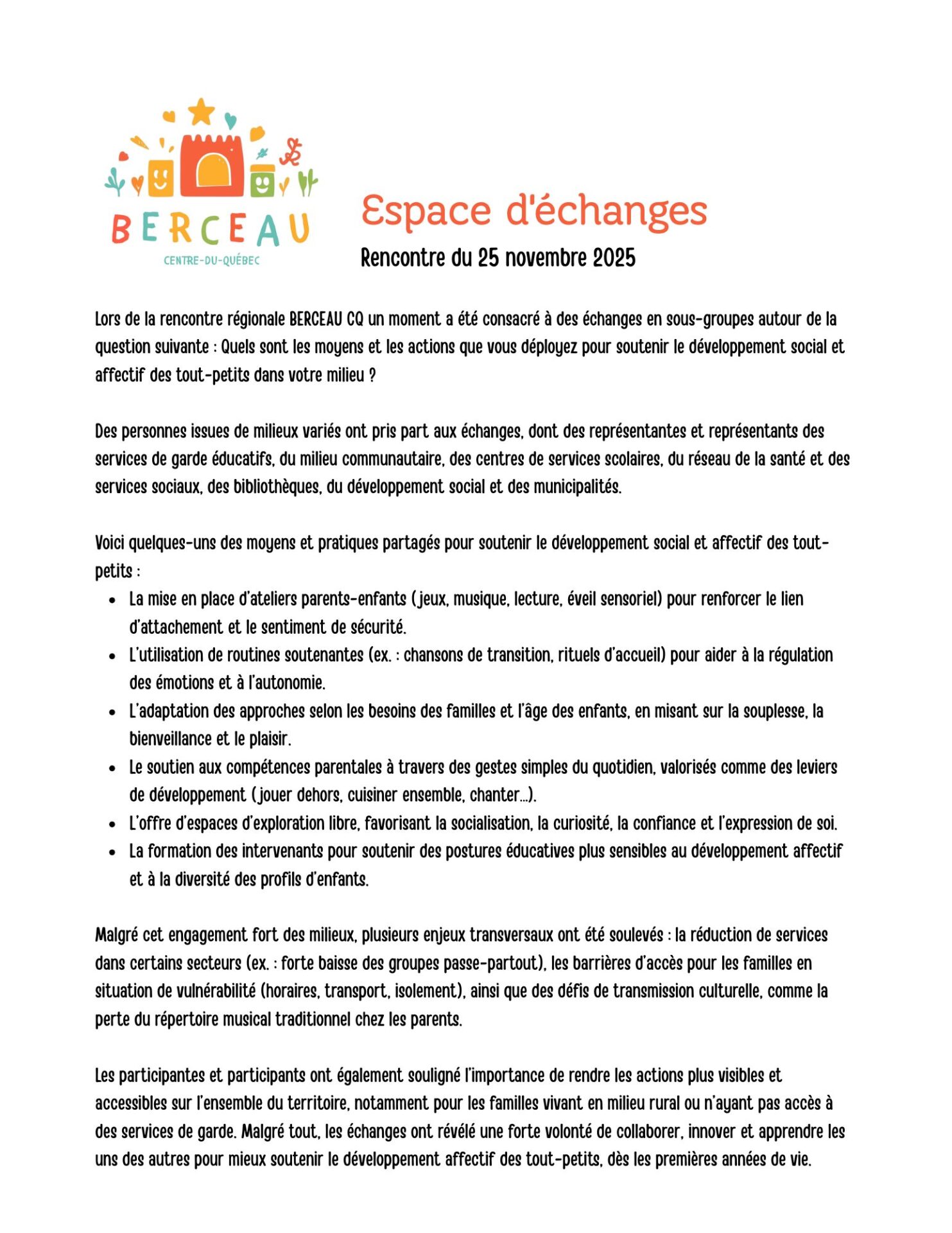 Il vise à soutenir les familles, particulièrement celles vivant des vulnérabilités, ainsi que les adultes qui gravitent autour des tout-petits. Le comité cherche à cartographier les actions existantes, combler les trous de service, favoriser la circulation d’information, et renforcer les compétences des intervenants, notamment par des formations et des outils communs.