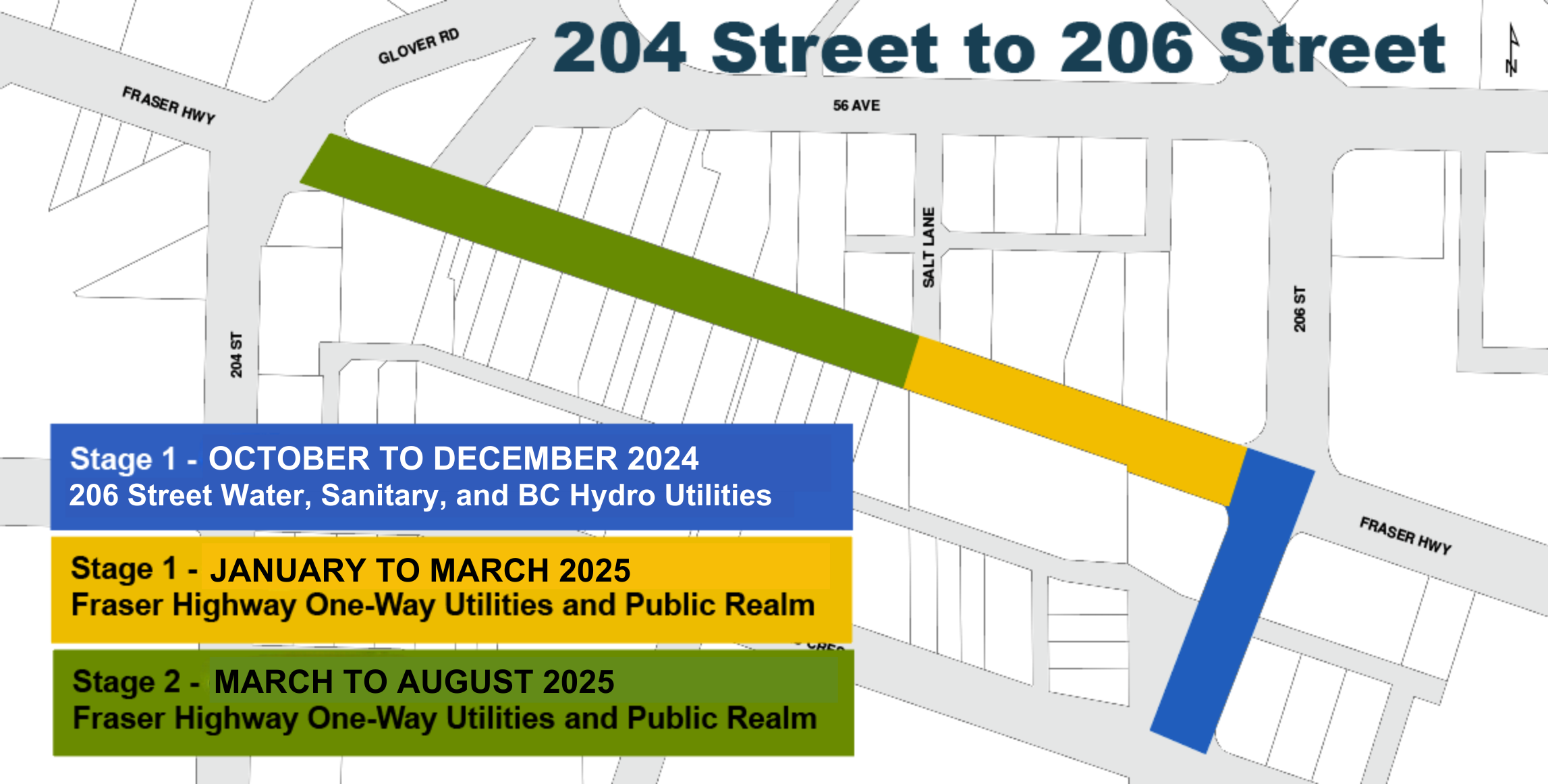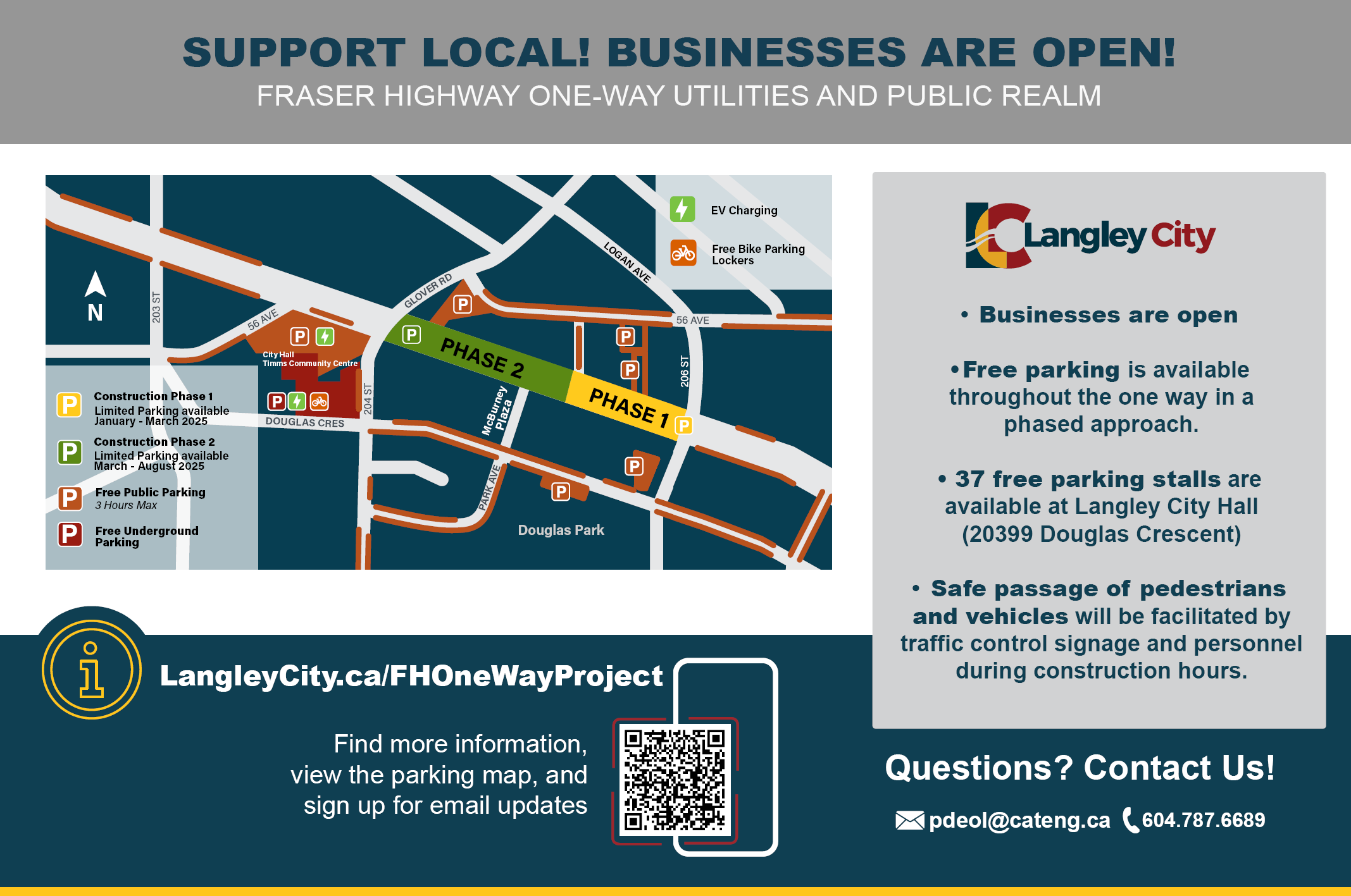 The Fraser Highway One-Way Project will improve the area for our businesses, residents, and visitors. It includes replacing aging underground infrastructure and revitalizing the Fraser One-Way with more greenery, new gathering spaces, and better pedestrian amenities.